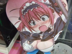 展示されていたとらのあなの説明によると「人気キャラ「トモエ」と最新キャラ「アイリ」が今、話題のむにむにジェル入り立体マウスパッドで登場。もちろん、やわらかジェルで再現されているのは、見果てぬ浪漫、神秘の秘境「胸の谷間」!!メイドと巫女の谷間に埋もれながら、マウス操作が出来る・・・そんな夢のようなPCライフを貴方へ。とらのあなホビー担当イチオシです!」というもの。(クイーンズブレイド公式)
