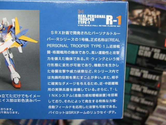 これは、プララジショー2006のコトブキヤブースでもサンプル展示のあったもので、コトブキヤの商品説明によると「差し替えにてR-ウィングへ変形可能!!精密なディティール・可動ギミック・迫力のアクション!人気ゲームソフト『スーパーロボット大戦ORIGINAL GENERATION』より、R-1がプラキットとして登場!!コトブキヤ初のR-ウィング形態への差し換え変形を再現した意欲作です。飛行形態は勿論のこと、ロボット形態もデザインの破綻をきたすことなく、高次元で昇華しております。」というもの。(GA:コトブキヤ驚異の精密キット「スパロボ」R-1発売直前レビュー!)