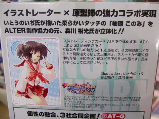 グッスマの商品説明によると「人気トレーディングカードV.I.Pを立体化する、AT-Gによる3D企画第2弾。すでにおなじみのタイトルToHeart2の人気キャラクター『柚原このみ』が登場です。「いとうのいぢ」氏が描いた柔らかいタッチのイラストを忠実に再現しました。ALTER制作協力の元、森川裕光氏の手により仕上げられた彼女は、立体ならではの魅力あふれる造形で、その完成度はイラストと見間違えるほどの出来栄え。スカートから覗く健康的な足、手に持った花など見所の多い作品です。是非お手にとってご堪能ください。」というもの。