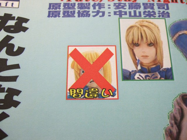 アキバで予約開始していた、ebCraft「HYPER FATE COLLECTION Fate/stay night セイバー」ですが、1月20日にはとらのあな本店でも予約受付が開始され、店内のPOPでは「なんとなくオーラ○トラーの頭をつけたくなりません?(サーバ○ン辺り)」とし「間違い」とされ、x印のついた顔パーツ(?)の画像があったので、てっきりこれの顔にxかと思ってみたら、これでしたw