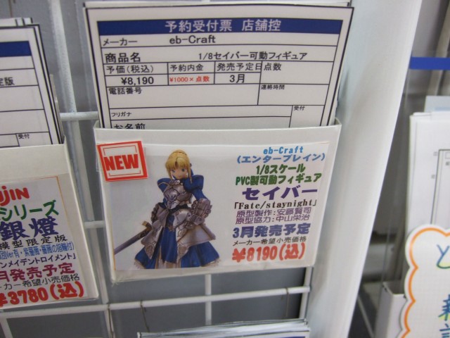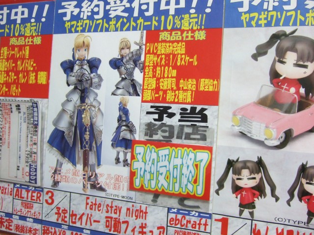 アキバのとらのあな本店以外の2007年1月20日現在のebCraft「HYPER FATE COLLECTION Fate/stay night セイバー」予約状況を確認してみたところ、ヤマギワソフトアニメ館が受け付け終了。ソフマップ本店は受付POPそのものがなくなっていたのでおそらく終了。ヤマギワソフト本店は受付中。コトブキヤ秋葉原店では予約受付予定はなし。他、予約受付をしているところは見かけず。