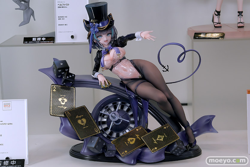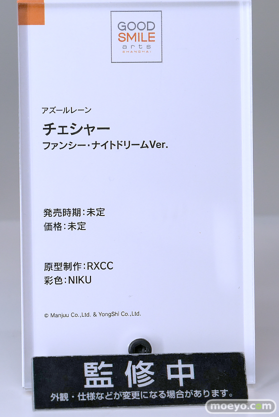 グッドスマイルアーツ上海の新作美少女フィギュア「アズールレーン チェシャー ファンシー・ナイトドリーム」の監修中原型が、「スマイルフェス2025」の会場で展示!『透け感のあるタイトスーツに身を包んだチェシャーは、愛らしさとセクシーさを兼ね備えた魅力を余すことなく表現。透明素材の衣装と繊細な塗装によって、ほのかに透ける肌の質感を繊細に再現しました。滑らかな黒タイツに包まれた美しい脚は、彼女の優雅さを一層引き立てます。』というもので、原型制作はRXCCさん。彩色はNIKUさん。その展示の様子を画像レビューとしてお伝えします!