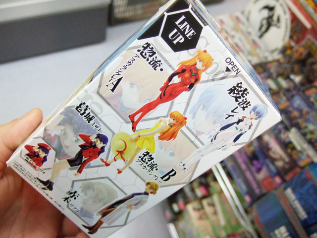 アスカA(プラグスーツ)、アスカB(ワンピース)、レイ、ミサト、リツコの5種+シークレット1種。全高約140mmで、1BOX10個入り。