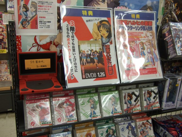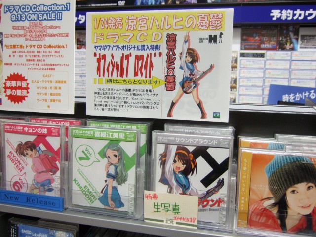 ほか、22日にはジャケットサンプル展示があった、涼宮ハルヒの憂鬱のドラマCD「サウンドアラウンド」(AA)と、キャラクターソング「Vol.6 キョンの妹」(AA)、「Vol.7 喜緑江美里」(AA)も、ゲーマーズ本店、キャラシティ、とらのあな本店、ヤマギワソフト本店などで発売されていました。