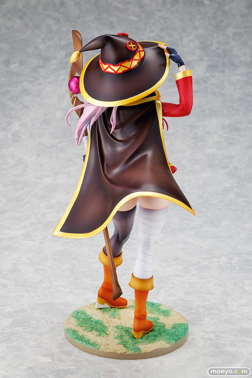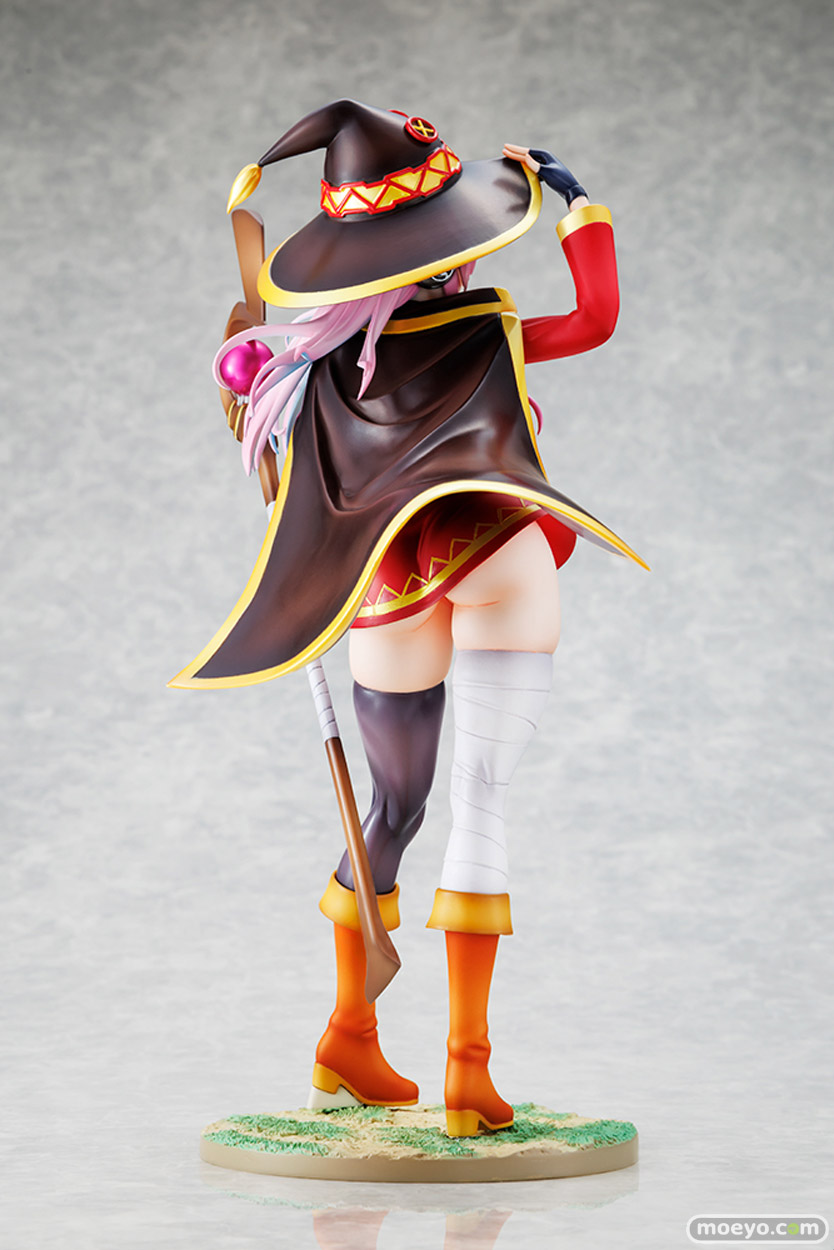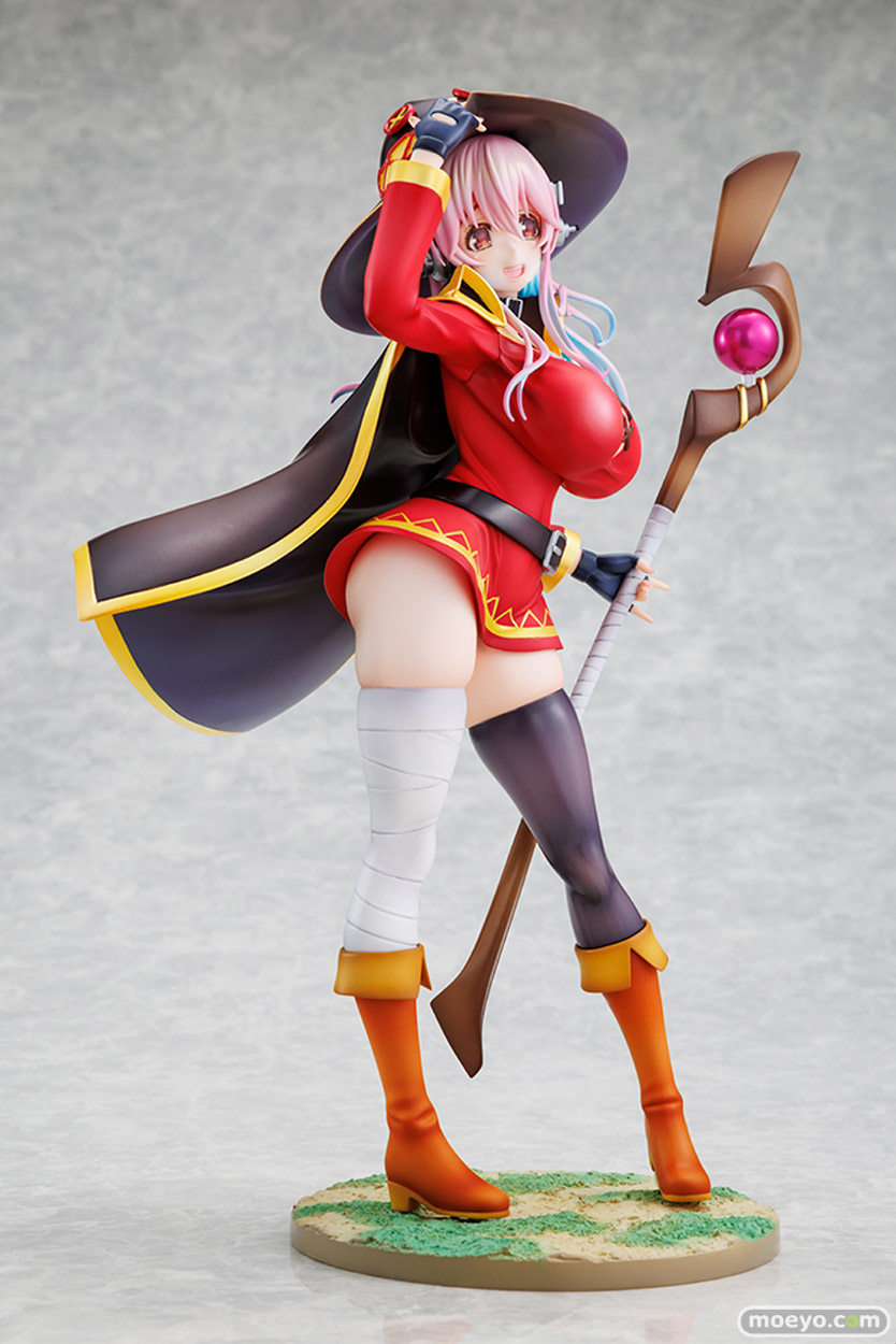 「すーぱーそに子 めぐみんver.」は、「もしすーぱーそに子がめぐみんの衣装を着たら…」というコンセプトのもと、すーぱーそに子のキャラクター原案・津路参汰氏による描き下ろしイラストをモチーフに立体化。衣装がはち切れんばかりの抜群のプロポーションを肉感豊かに再現しているほか、差し替え表情パーツ、胸パーツが付属するので、胸元がはだけて慌てているシチュエーションも楽しめます。