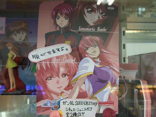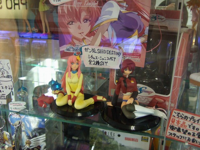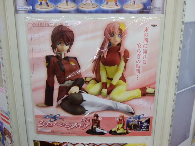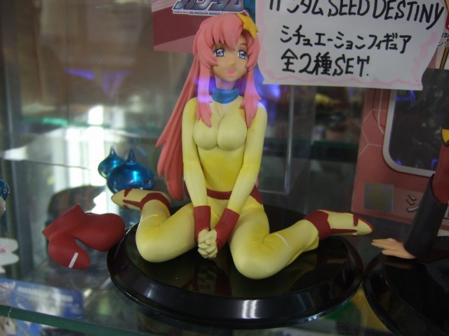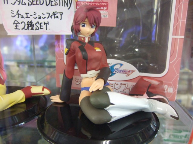 1月23日、バンプレストプライズ「 ガンダムSEED DESTINY シチュエーションフィギュア」(AM)が入荷していました。これは、ガンダムSEED DESTINY の、ノーマルスーツ姿のミーアと、軍服姿のルナマリアを座ったポーズで立体化したもの。ハビコロ玩具では「脱がせますよ。」として、スカート外したルナマリアと、胸アーマー(?)をはずしたミーアのサンプルを展示していました。