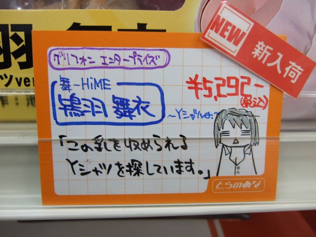 とらのあな本店でも入荷していて、コトブキヤ秋葉原店で撮らせていただいたサンプルでも、どう見てもYシャツに収まらなそうだったはち切れんばかりの乳だったことからか、舞衣のヘタレPOPには「この乳を収められるYシャツを探しています。」とされていましたw