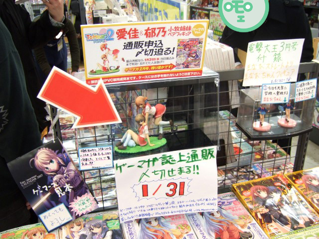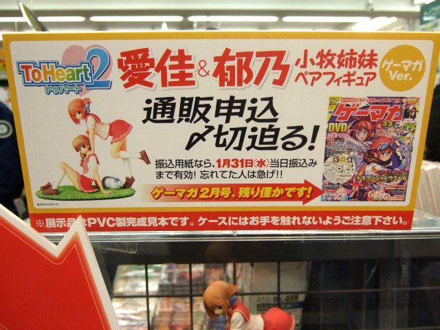 ゲーマーズ本店にて、ゲーマガ誌上通販、SBCrショップ、コトブキヤ限定販売となる「ToHeart2 愛佳&郁乃 小牧姉妹 ペアフィギュア ゲーマガver.」のPVCサンプルが展示されていました。POPによると「現在世の中に3体しかないうちの1体」みたい。別のPOPでは、応募用紙付の「ゲーマガ 2007年 02月号」(AA)の画像が掲載され「忘れてた人は急げ!」としてました。