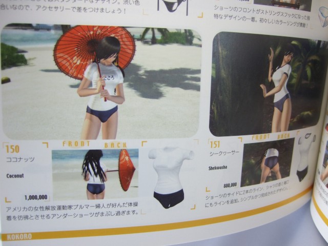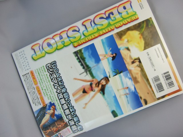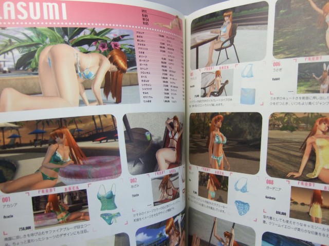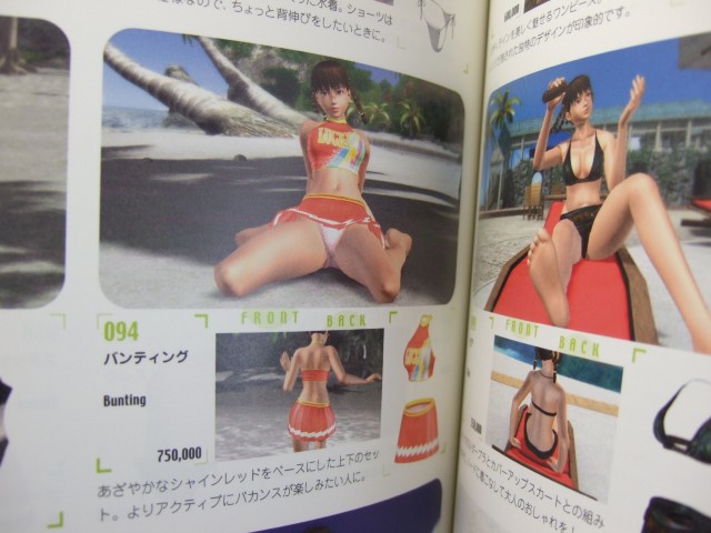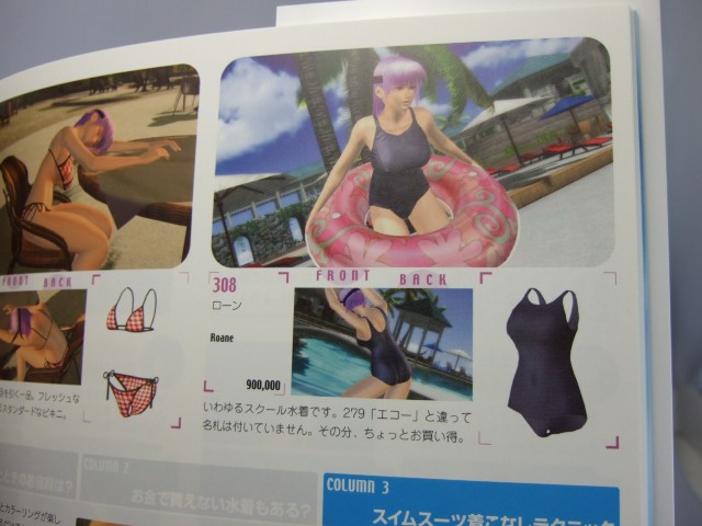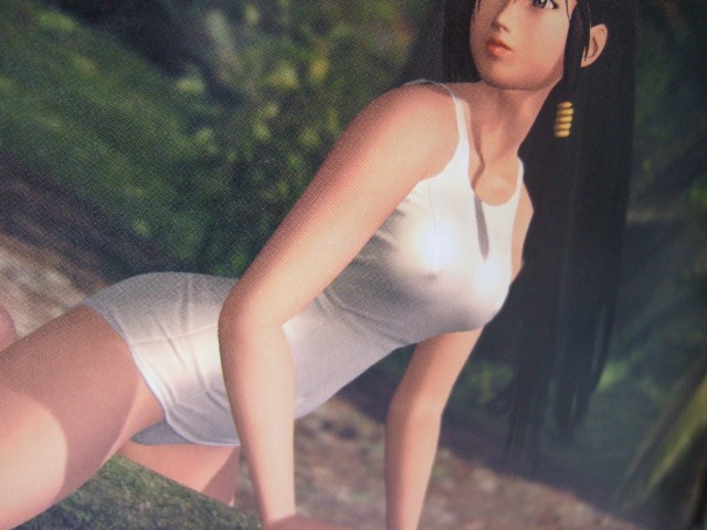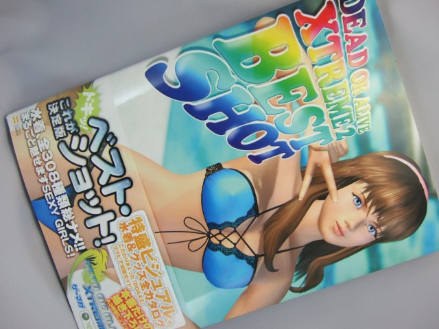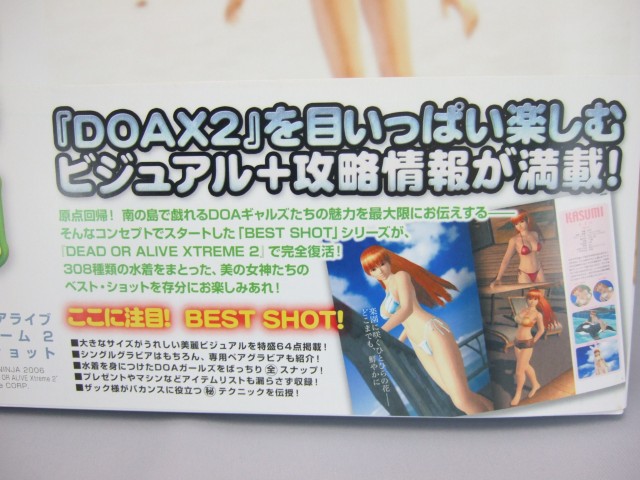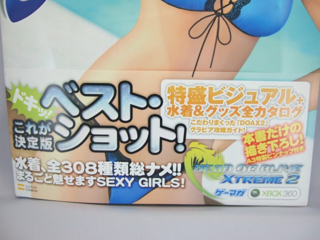 これは、霞のほぼ等身大むねぽちPOPや、その、先端はボタンなのかッ!?等、いわゆるむねぽち表現があった、テクモのXBOX360ソフト「デッド オア アライブ エクストリーム 2」(AA)のグラビア攻略ガイドで、オビ表によると「水着、全308種総ナメ!!」「特盛ビジュアル+水着&グッズ全カタログ」と謳われているもの。