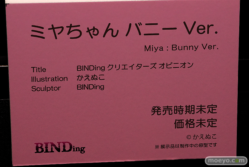BINDing「ミヤちゃん バニー Ver.」(監修中原型) *掲載の展示アイテムは原則的に監修中や製作中のものとなります。 実際の商品とは若干異なる場合がございますので、予めご了承ください。 撮影:いつもの友人/もんぷち。 文:もんぷち。 関連 ■「第11回 ネイティブグループ合同展示会(エロホビ)」の記事一覧 ■BINDing ■ネイティブ © かえぬこ