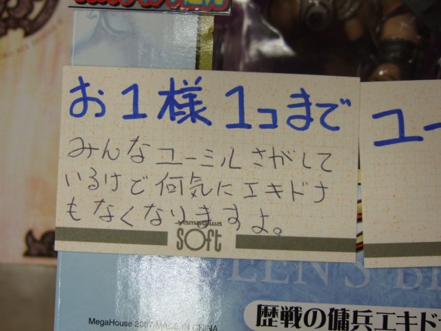 というわけで、アキバでは30日の時点で、ユーミルはほぼ見かけることが出来ませんでしたが、ヤマギワソフトアニメ館のPOPによると、「お1人様1コまで。みんなユーミルさがしているけど 何気にエキドナもなくなりますよ。」と書かれていました。