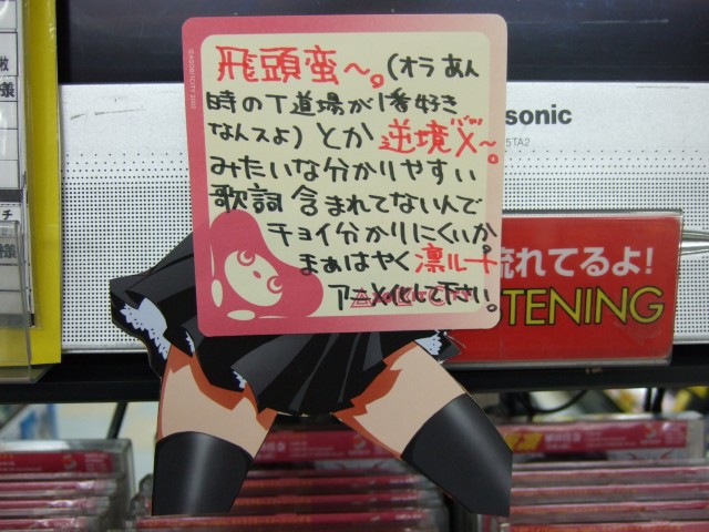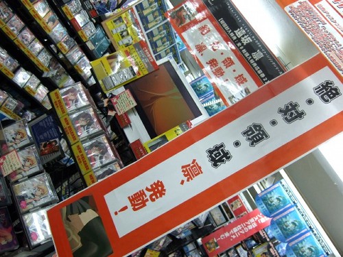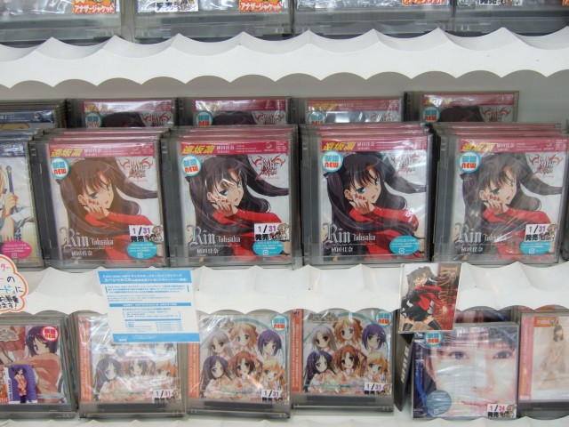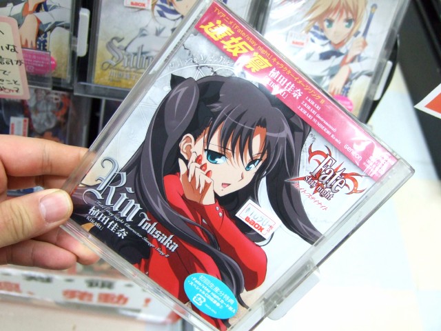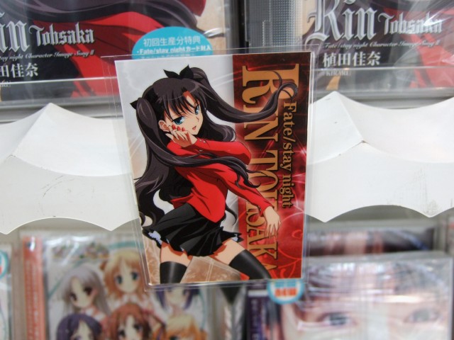 1月30日、先月発売された第1弾「セイバー(川澄綾子)」(AA)に続き、Fate/stay night キャラクターイメージソング第2弾となる「遠坂凛(植田佳奈)」(AA)が発売されました。キャラシティでは、棚のエンド部分一つを使って展開していて、付けられていた垂れ幕には「絶・対・領・域 凛、発動!」として、凛のミニスカ、ニーソの絶対領域のアップ画像などを掲示していました。