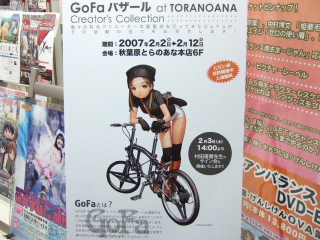 2月2日から12日の間、とらのあな本店6Fにて、「GoFaバザールat TORANOANA Creatora’s Collection」が開催されています。これは、「青山にあるGoFa(ギャラリー・オブ・ファンタスティック・アート)の活動の全てをお見せします!」という、GoFaが関わったグッズやイラストなどの展示、販売イベント。フロア中央には、村田蓮爾氏デザインの、自転車とソファの実物も。