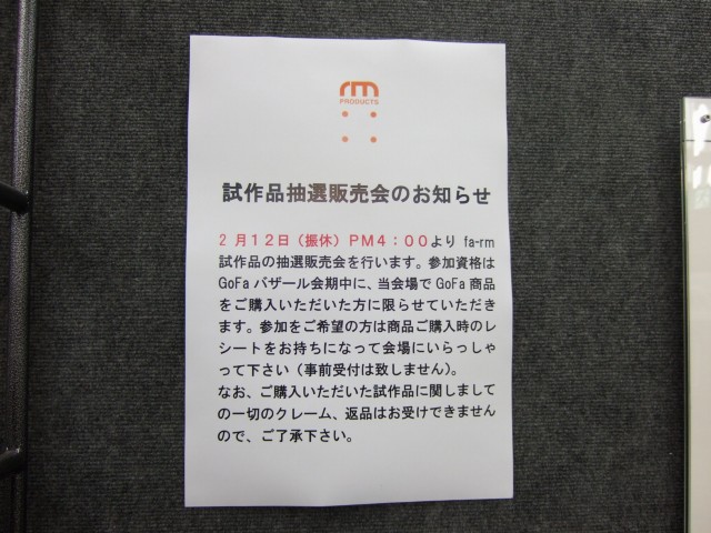 GoFa公式のGoFaバザールのお知らせによると「2月2日から12日まで、秋葉原のとらのあな本店6Fイベントスペースで「GoFaバザール at TORANOANA」を開催します。内容は今までGoFaで行ってきたアートショーを振り返る回顧展的な展示で、イベントで限定販売されたグッズの販売なども行われます。fa商品ももちろん展示販売しますが、今回の目玉として特別に村田蓮爾さんの許可を得て、開発途中で制作された試作品類の展示と抽選販売も行います。また村田蓮爾さんのサイン会も3日に行われる予定です。入場は無料ですのでぜひご来場ください。」というイベント。