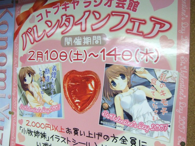 コトブキヤラジオ会館コトブキヤ秋葉原店では、昨年(2006年)、タマ姉が黒ニーソ絶対領域でお出迎えしてくれ、タマ姉チョコがもらえた「タマ姉バレンタインチョコプレゼントイベント」が開催されていましたが、今年も同様のチョコ配布イベントを開催するらしく、告知ポスターなどの掲示が開始していました。
