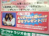 コトブキヤラジオ会館コトブキヤ秋葉原店では、昨年(2006年)、タマ姉が黒ニーソ絶対領域でお出迎えしてくれ、タマ姉チョコがもらえた「タマ姉バレンタインチョコプレゼントイベント」が開催されていましたが、今年も同様のチョコ配布イベントを開催するらしく、今年(2007年)は「小牧姉妹」のシール付チョコがもらえるみたいです。2月10日にはえりすさん&蘭さんもくるみたい。
