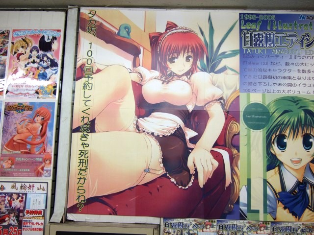 1月27日にはソフマップ本店で予約開始していた、甘露樹氏初の氏個人画集「Leaf Illustrations 甘露樹 エディション」(SA)ですが、週末にはアキバ各地の取り扱い予定店舗で予約が開始されていました。ソフマップ4号店の店舗壁際には、大きく引き伸ばされた、乳首浮いてるメイド服タマ姉のイラストが掲示され、それによると「タカ坊、100回予約してくれなきゃ死刑だからね?」