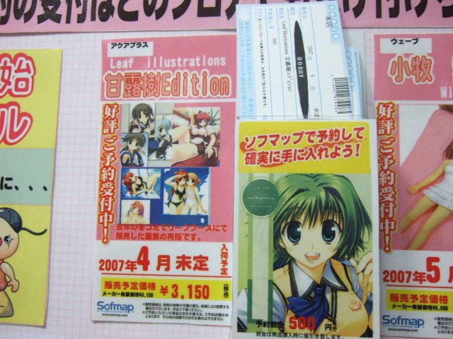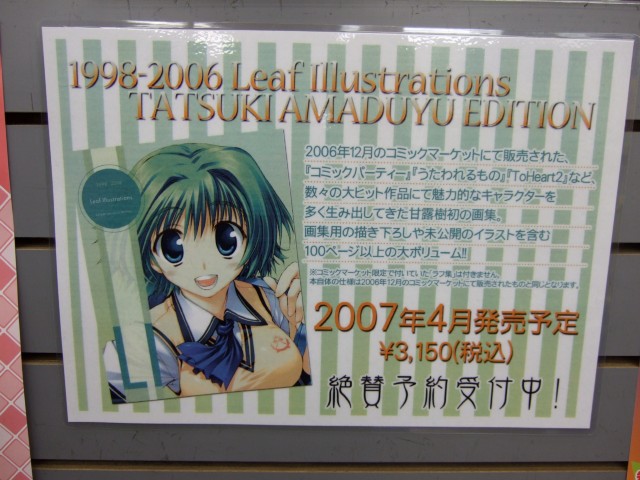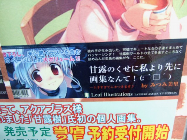 1月27日にはソフマップ本店で予約開始していた、甘露樹氏初の氏個人画集「Leaf Illustrations 甘露樹 エディション」(SA)ですが、週末にはアキバ各地の取り扱い予定店舗で予約が開始されていました。ソフマップ4号店では、大きく引き伸ばされたメイド服タマ姉のイラストが掲示されていました。
