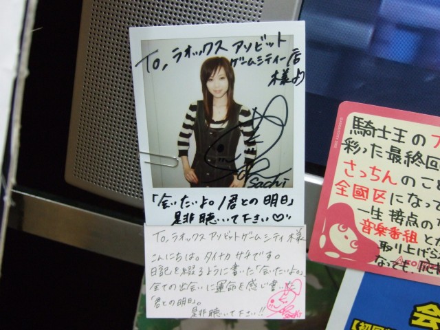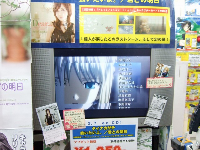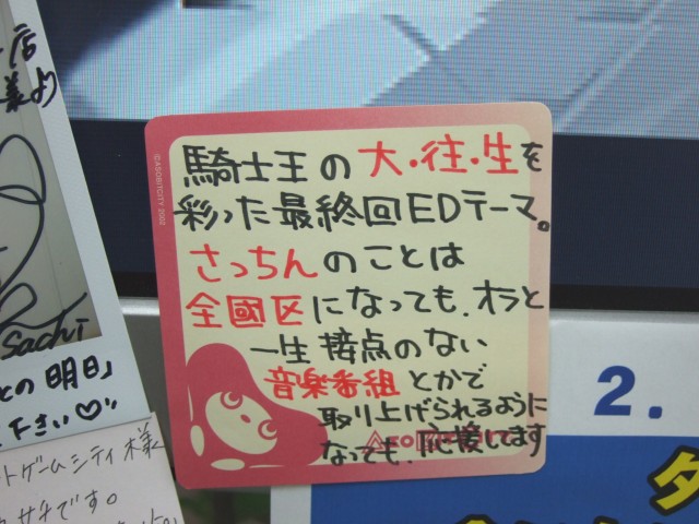 ゲームシティでは、陳列棚の一角を使って特設コーナーが作られていて、「騎士王の大・往・生を彩った最終回EDテーマ」とかかれたPOPや、タイナカ サチさん直筆のメーッセージなどが掲示されていました。