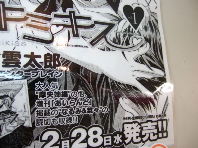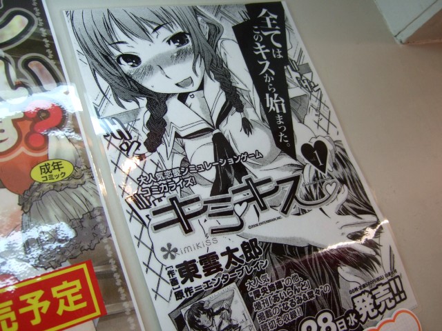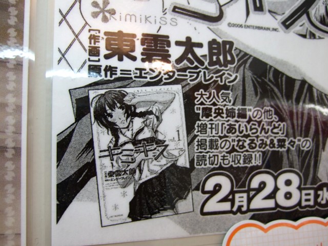 PS2「キミキス」(AA)を原作として、「また。したいの?」とか言って覆いかぶさったり擬音で「れるん」「ちぷ」などもあった、東雲太郎氏著作のコミック「キミキス-various heroines 1巻」(AA)が2月28日発売予定となっています。とらのあな1号店の大人向け売場のB1でも販売予定みたいで、第1話の膝キスシーンを用いたPOPが掲示されていました。販売理由は「エロイので。」