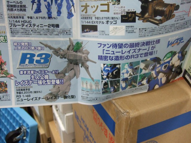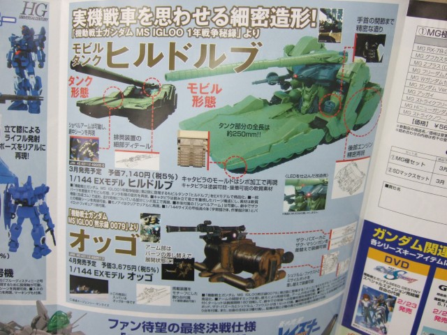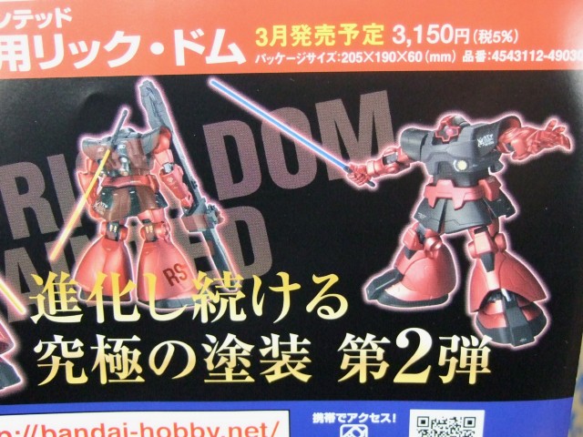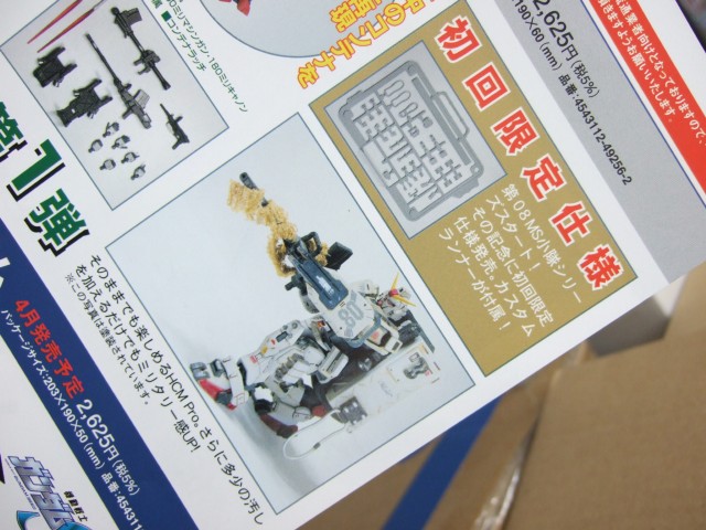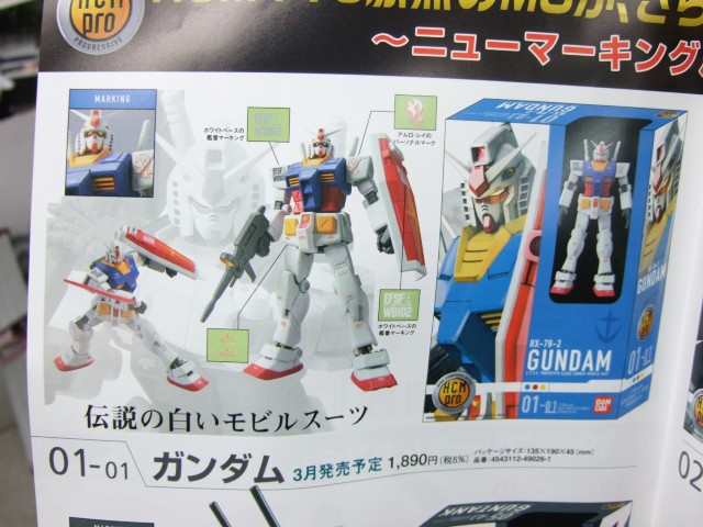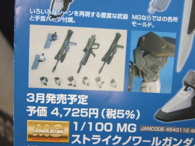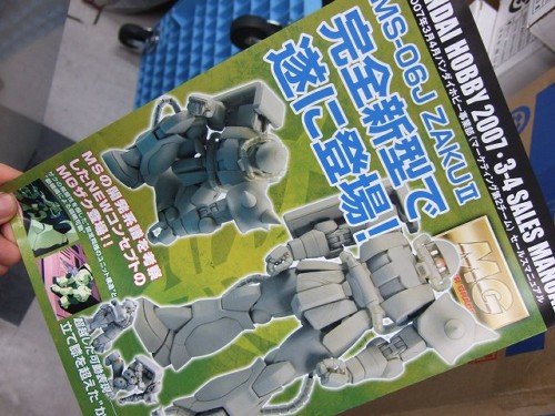 アキバの某店にて、「1/100 MG MS-06J 量産型ザク Ver.2.0」(AA)や、「1/100 アカツキガンダム オオワシパック/シラヌイパック フルセット」(AM)、「1/144 HGUC ブルーディスティニー 2号機」(AA)、「HCM-Pro38 陸戦型ガンダム」(AA)、「HCM-Pro39 フリーダムガンダム」(AA)等が掲載された、バンダイ3、4月の小売店向け情報パンフレットを見せて頂きました。