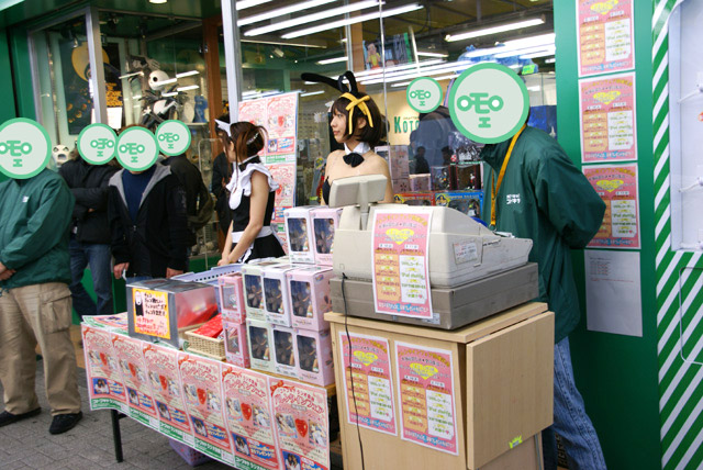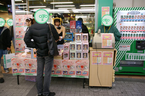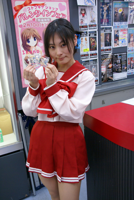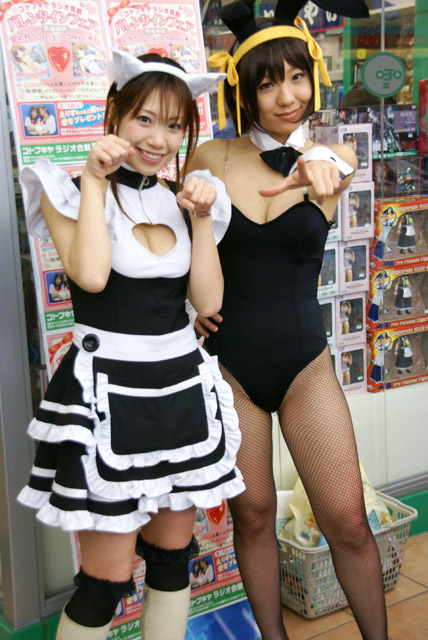 以前お伝えしたように、2月10日から、コトブキヤラジオ会館秋葉原店にて、2000円以上買い物で「小牧姉妹」どちらかのシール付チョコがもらえる「バレンタインフェア」が開催されています。フェア初日のコトブキヤラジオ会館には、「探偵ファイル」のえりすさんと蘭さんがこられていて、胸元の開いたメイド服やハルヒバニーのコスプレ等で、チョコを手渡しされていました。