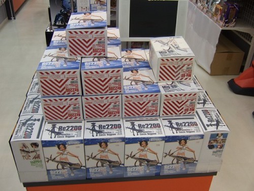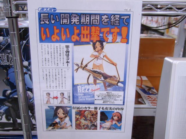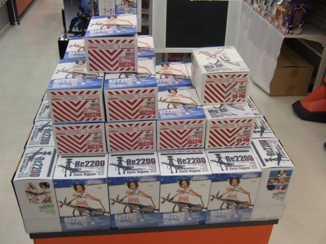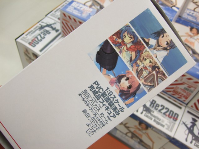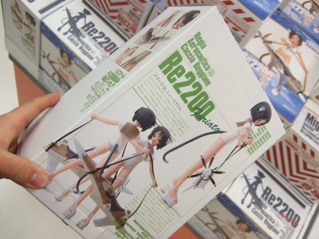 「長い開発期間を経ていよいよ出撃です!」とされたPOPの解説部分によると、「メカと女の子の萌えな組み合わせをご堪能ください! 新進気鋭クリエイター島田 フミカネ氏が生み出したキャラクターが完成品フィギュアとなって登場! 今回は「Re2200」(通称イタリアさん)をリリースいたします!セーラー服+スク水という組み合わせという大変可愛らしいお姿。さらに今回は白スクール水着&縞ぱんつ2種のコンパチボディ付き!なんと日焼け跡もバッチリ再現という、破壊力満点の仕上がりになっています。 」と紹介されています。