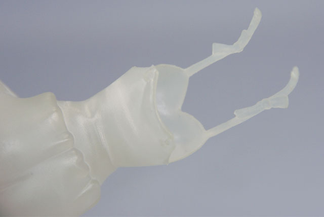 で、ワンピースですが、成型はなんと1パーツになっていて、肩ヒモ部分が軽く接着されているのでそれを外して上着部分をめくると、乳下のブラと素肌の境目が分割線になっているので、うまいこと外して、ねじるように上から引き抜くと・・・