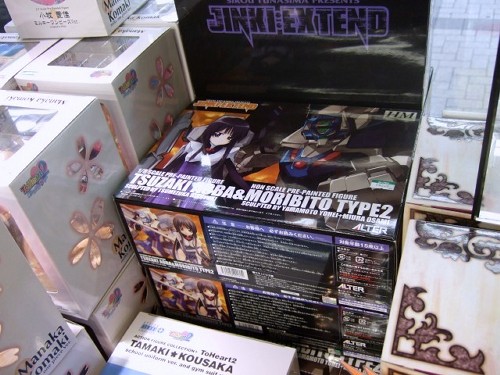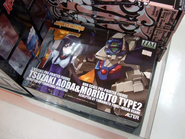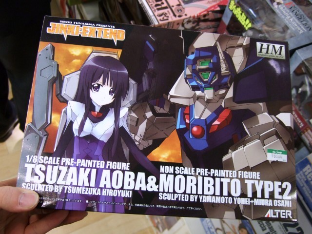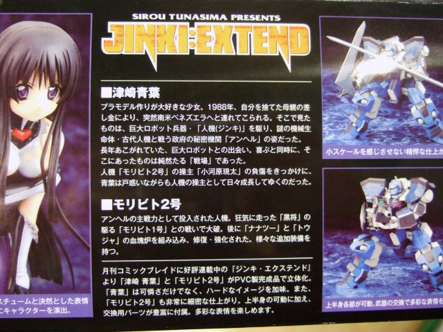 これは、ワンフェス2006夏のアルターブースでもサンプル展示のあったもので、グッスマの商品説明によると「メカ大好き!!プラモ作りが趣味の中学生。 ロボットアクションコミックの最高峰『JINKI:EXTEND』より、ヒロイン津崎青葉と青葉の操る人機「モリビト2号」がセットで登場です。戦闘中を思わせるバトルダメージ版のコスチュームと、彼女らしい繊細なしぐさが、青葉のかわいらしさをひきたてます。アルター初のロボット造形「モリビト2号」は、手や武器の換装パーツが付属し、上半身の各部が可動。作中のシーン再現など、遊び要素をプラスした作品となっています。」と紹介されています。