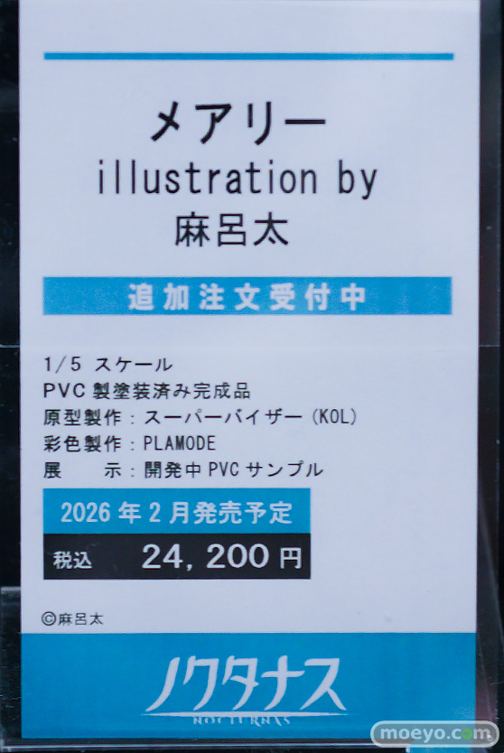 「冥途武装:Javelin street ver.」「ケモミミチアガール」「メアリー」など 「宮沢模型 第47回商売繁盛応援セール」会場で見かけた新作フィギュアレポート「ノクターン」編業界関係者向けの内覧会となる「宮沢模型 第47回商売繁盛応援セール」の会場で見かけた美少女フィギュアを中心に、画像レビューとして、何回かに分けてお伝えします!こちらで画像の「冥途武装:Javelin street ver.」や「ケモミミチアガール DX Ver. illustration by やたぬき圭」「メアリー illustration by 麻呂太」などのサンプル展示があった「ノクターン」ブースの様子を特集で。