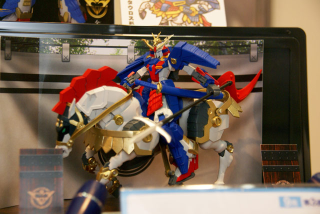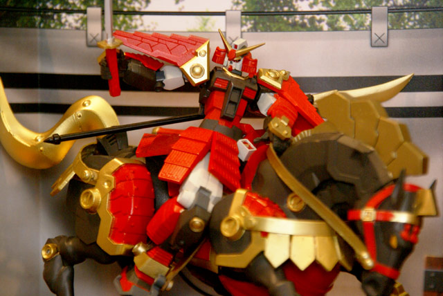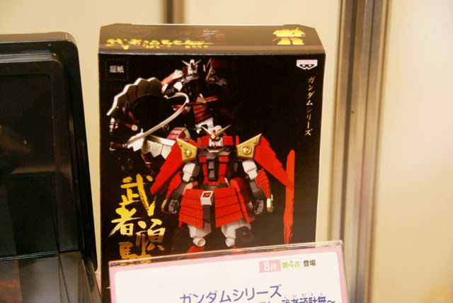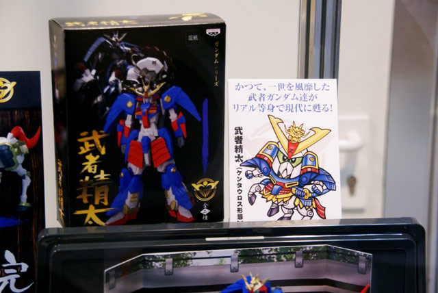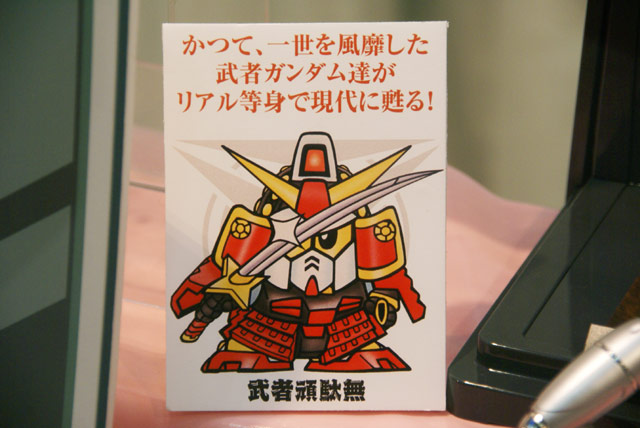 武者頑駄無とは、はてなダイアリーによると「もともとは『プラモ狂四郎』にて、四郎が製作した『妖怪退治にうってつけのガンダム』としてガンダムに甲冑をまとわせた『武者ガンダム』を作中に登場させたのがはじまり。もともとガンダムは甲冑姿の武将をイメージしてデザインされたもので、デザイン的な帰結と一部では言われている。」というもので、横にあったPOPによると「かつて一世を風靡した武者ガンダム達が、リアル等身で現代に蘇る!」と紹介されていました。(プラモ狂四郎 – Wikipedia)