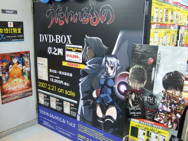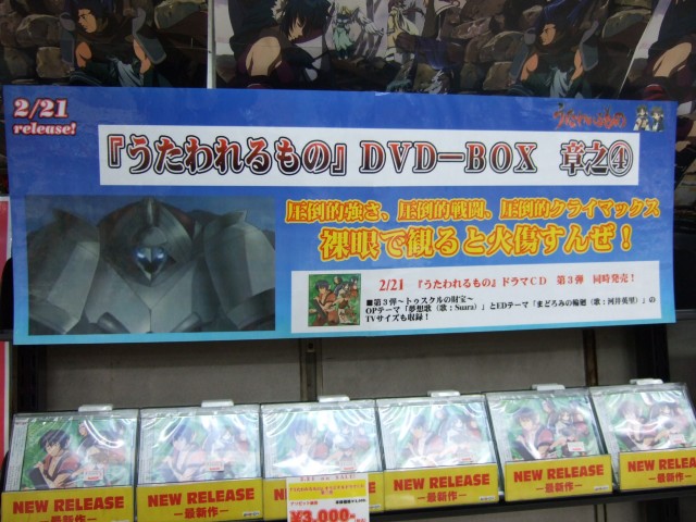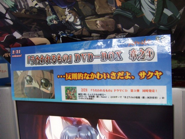2月20日、DVD「うたわれるもの DVD-BOX 章之四」(AA)が発売されました。これは、アニメ「うたわれるもの」の第20話から26話までを収録したDVD最終巻。ゲームシティではエスカレーター手前に巨大POPが掲示され、Purity Whiteさんが、「無駄に揺れるムツミのおっぱい。(滅)」と紹介されているムツミの、むねぽち&Vゾーンの描き込みが無駄にすごいイラストを掲示w