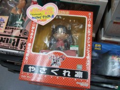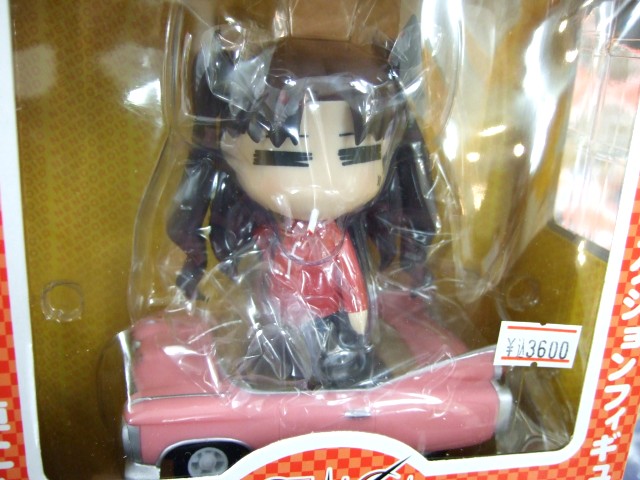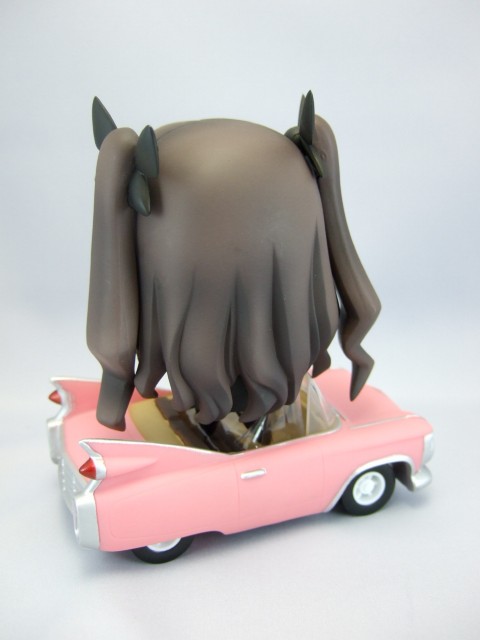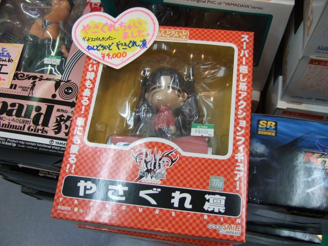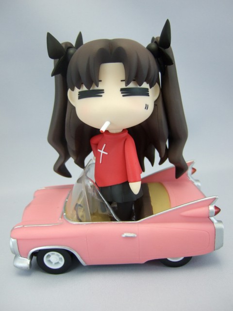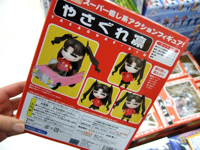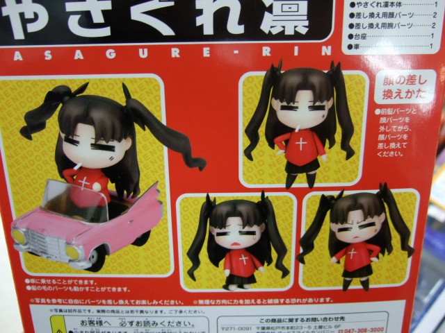 これは、キャラシティやとらのあな本店等で、サンプル展示もあった、Fate/stay nightのタイガー道場等に登場する、つくりものじ氏デザインのやさぐれ凛を、2006年10月に発売されたへたれセイバー(参考レビュー)に続き、ねんどろいどとして立体化したもので、グッスマの商品説明によると「多くは語らず、ただやさぐれるだけ…。今後も続々リリース予定の“ねんどろいどシリーズ”。第4弾は『やさぐれ凛』の登場です。「へたれセイバー」に続き「つくりものじ」氏の描くディフォルメキャラを、やさぐれ感もそのままに立体化。今更説明するまでもない彼女の雰囲気を忠実に再現しています。付属の車はもちろん搭乗可能! 細部のディティールまでこだわった逸品。髪の毛にも可動ジョイントを仕込み、走行中の疾走感も再現できます。お手軽に楽しめる「ねんどろいど」、コレクションして癒されてください。 」と紹介されています。(サンプル展示)