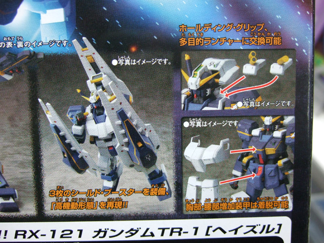 これによると、3枚のシールドブースターで高機動形態を再現。ホールディンググリップ、多目的ランチャーに換装可能で、胸部腰部アーマーも脱着可能みたいです。