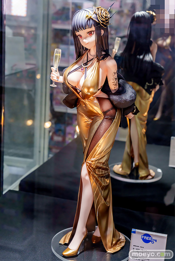 フリーイングの新作美少女フィギュア「勝利の女神:NIKKE D:キラーワイフ – シークレットパーティークリーナー」の彩色サンプルが、あみあみ 秋葉原ラジオ会館店で展示!『人気スマートフォンゲーム『勝利の女神:NIKKE』より、エリシオンの暗殺部隊〈シージペリラス〉所属の“D”が、シャンパンゴールドのドレスをまとった「シークレットパーティクリーナー」姿で登場。艶やかなドレスは、設定どおりサイドをシースルーで表現。』というもので、原型制作は宇治川法幹(ドラゴンクラフト)さん。彩色は月柳さん。制作協力はドラゴンクラフトさん。その展示の様子を画像レビューとしてお伝えします!
