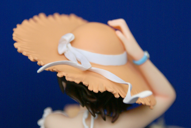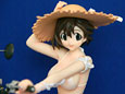 これは、2006年11月29日に発売された、Mine bluE#10「白い原付で海に向かう、青い水着の女の子」(参考レビュー)を、「透け水着」に変更したカラバリで、やまとの商品説明によると「ケロロ軍曹」の原作者であり、「OSアイドルWINちゃん」のキャラクターデザインでも知られる人気漫画家/イラストレーター・吉崎観音(よしざき・みね)氏のイラスト集「Mine bluE 吉崎観音イラスト集 1994-2004」より、バイクに乗った女の子をCerberus Project TMのSunny Day氏とNS. GUN氏が繊細かつキュートに立体化したステキすぎるフィギュアです!バイクのディテールにも注目!大好評だった「白い原付で海に向う、青い水着の女の子」が妄想の中でしかありえない透け水着で登場!バイクのカラーリングやディテールを一部変更した限定仕様です!!」と紹介されています。また「同梱の追加リボンパーツは、おまけパーツです。お客様のお好みで左腕分割部にとりつけることができます。」と書かれていて、左腕の分割線を隠すパーツが追加されています。これはうれしいおまけですね!w