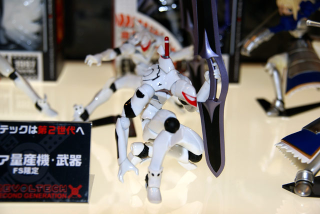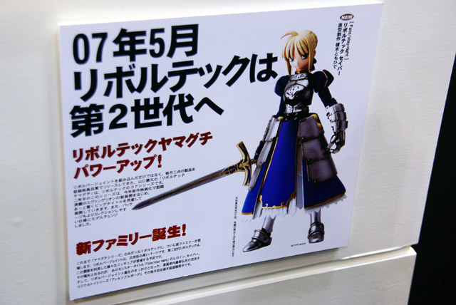 展示されていたショウケースにあったPOPによると、「07年5月 リボルテックは第2世代へ リボルテックヤマグチパワーアップ!リボルバージョイントを組み込んだだけではなく、毎月二点の製品を低価格高品質でリリースしてきた山口勝久氏の「リボルテックヤマグチ」は、リボルテックのコアシリーズです。二年目のこのシリーズは、今年新年映画化で話題満載のエヴァンゲリオンの親展開をはじめ、あっと驚くビックタイトルを用意して展開していきます。またパッケージもよりコレクションしやすい仕様にモデルチェンジしました。」「新ファミリー誕生! これまで「ヤマグチシリーズ」のみだったリボルテックに、ついに新ファミリーが登場します。リボルバージョイントは、汎用性の高いパーツです。第二世代リボルテックは、この関節を利用した様々なフィギュアが登場する予定です。その嚆矢となるのが、あのモンスタータイトル「Fate/stay night」のヒロイン、セイバー。そして、リボルバージョイント誕生のきっかけとなった、漫画家内藤泰弘氏の完全オリジナルトイシリーズ「アッセンブルボーグ」、その他大型企画を鋭意開発中です。」と紹介されています。