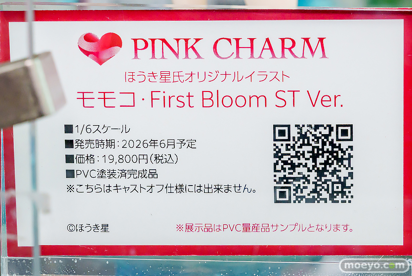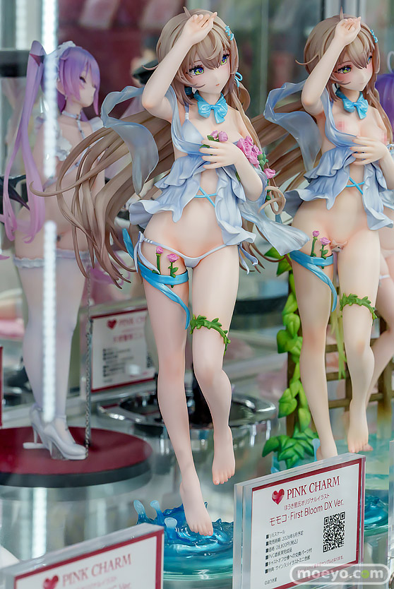 Pink・Charmの新作エロフィギュア「ほうき星氏 「モモコ First Bloom DX Ver.」」の彩色サンプルが、一般向けの「ST Ver.」と一緒にあみあみ秋葉原フィギュアタワー店で展示!『ほうき星氏初のオリジナル「モモコ」ちゃんは薄い髪色のあどけない表情と可憐なしぐさに魅了されます。透明感ある布とミルクティー色の髪はクリアー樹脂を贅沢に使用美しいボディラインとかろやかで流れるような髪の造形をお楽しみください。』というもので、DX版には交換式ボディが付属し、パンティは取り外し可能!原型制作は金坂さん。彩色制作はグラハム仮面さん。その展示の様子を「ST Ver.」「DX Ver.」ともども画像レビューとしてお伝えします!(アダルトフィギュアとなります!18歳未満の方は閲覧をお控えください。)