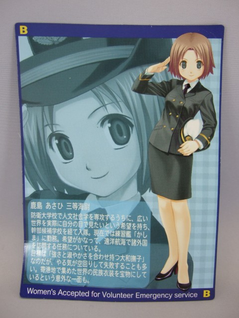 鹿島あさひ(かしま あさひ)三等海尉(幹部用 常装 冬服)の脱帽姿勢の製品版前後と、付属のキャラクターカード。