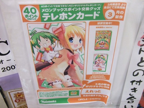 以前、「乳首勃起」「金棒股間押し当て」の交換テレカもお伝えしたことのある、メロンブックスの3月ポイント交換テレカ絵柄が店頭で公開されていました。今月のテレカの絵柄の作画は、ちゅるやさんの生みの親である、うつらうららかえれっと氏が担当されています。れもんちゃんは普通にかわいく描かれていますが、めろんちゃんはどう見ても・・・にょろーん(´・ω・`)