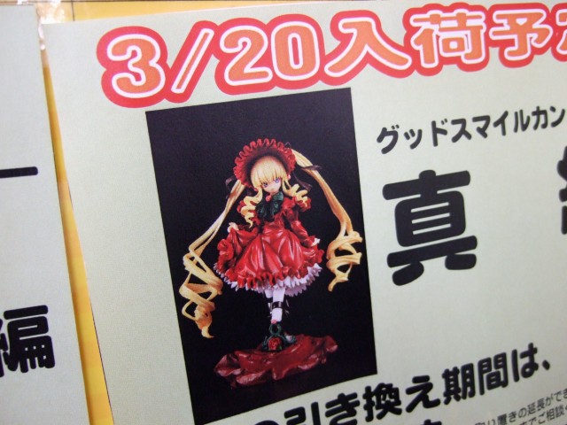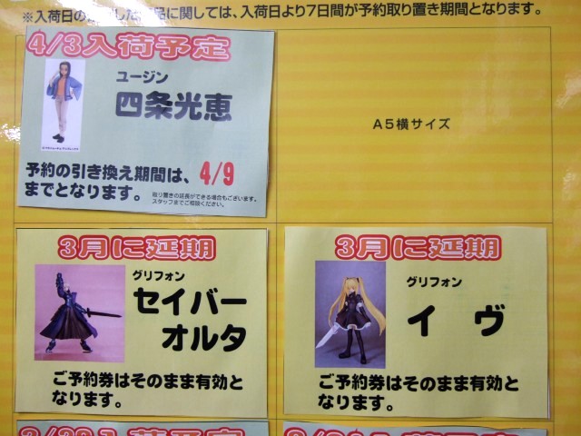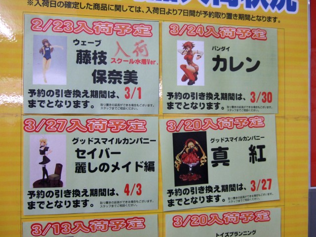 以前、バンダイ「乙女魂 コードギアス カレン」(RA)の入荷予定が3月24日と掲示されていたことをお伝えした、ソフマップ本店のフィギュア入荷日掲示板に、グッドスマイルカンパニー「Fate/hollow ataraxia セイバー 妄想・麗しのメイド編」(RA)や「ローゼンメイデン 真紅」(AA)等、グッスマ流通等の発売予定も追加されていましたので、それら入荷予定日ををまとめてお伝えします。