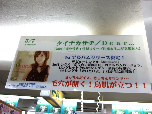 2月6日、以前「1億人が涙したラストシーン」とされた、アニメ「Fate/stay night」の最終話に流れた挿入歌「君との明日」収録のシングル「会いたいよ。/君との明日」(AA)の発売をお伝えした、タイナカ サチさんの1stアルバム「Dear…」(AA)がゲームシティにて発売されていました。