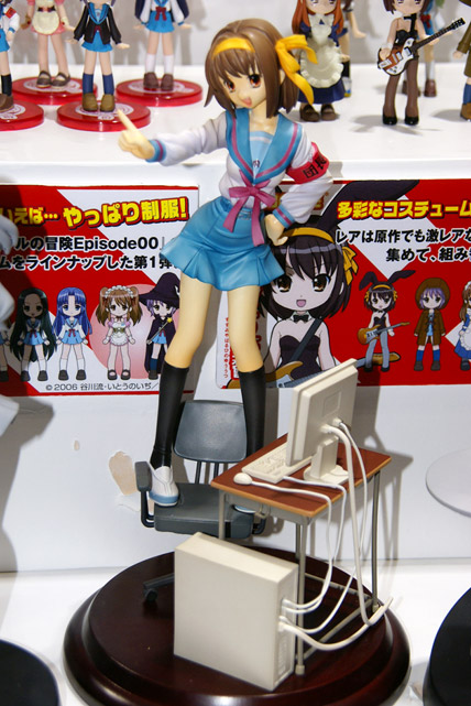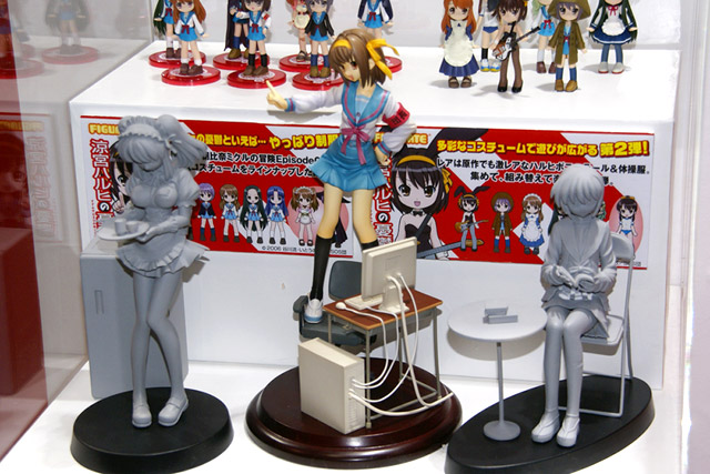 2月6日、キャラシティ5Fにて、コナミ コナミフィギュアコレクション 涼宮ハルヒの憂鬱「涼宮ハルヒ」(AM)、「長門有希」(AM)、「朝比奈みくる」(AM)3体の予約受付が開始されていました。これは、トイフォーラム2007で初展示され、ワンダーフェスティバル2007冬のコナミブースでも展示されていた、宮川武氏原型で、ジオラマ風ベースが付属し、部室の一部が再現されているもの。