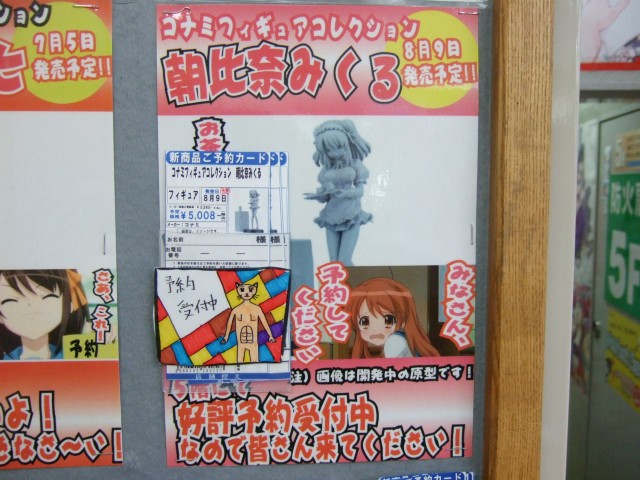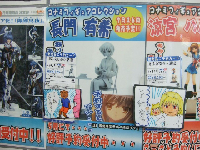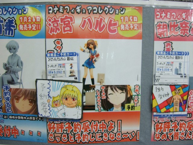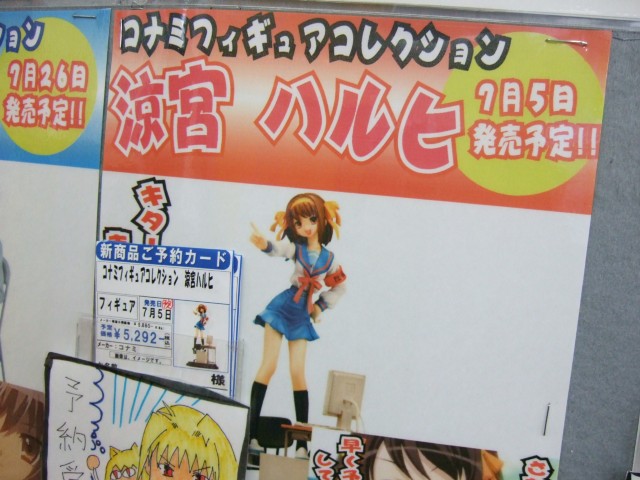 なお、ヤマギワソフトアニメ館では、マックスファクトリーのハルヒ(参考レビュー)を予約分確保できたみたいで「涼宮ハルヒ3次出荷の予約の方まで全員分の確保できました!2、3次分の予約表で商品の購入できます!」というPOPが掲示されていました。