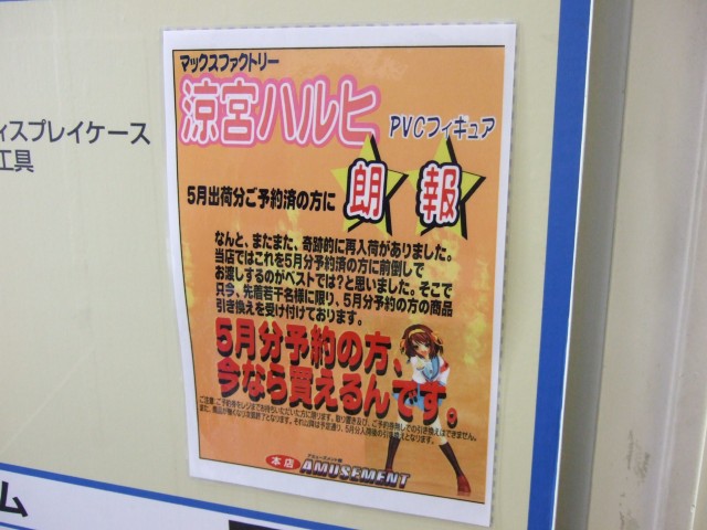 ソフマップ本店でも「マックスファクトリー 涼宮ハルヒ 5月出荷分ご予約の方に朗報!なんと、またまた、奇跡的に再入荷がありました。当店ではこれを5月分予約済の方に前倒しでお渡しするのがベストでは?と思いました。そこで只今先着若干名様に限り、5月予約の方の商品引き換えを受け付けております。5月予約の方、今なら買えるんです。」というPOPが掲示されていました。