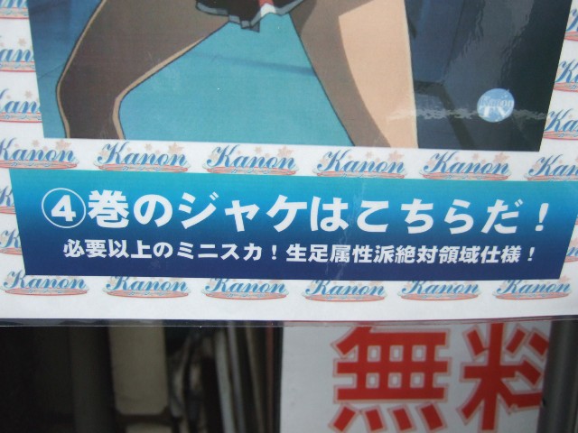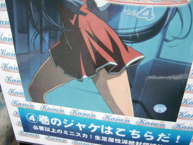 3月6日に発売された、DVD「Kanon 3巻」(AA)を「まさに、技術の無駄遣い、感動の無駄遣い!」としていたゲームシティ店頭にて、4月4日発売予定のDVD「Kanon 4巻」(AA)の、コトブキヤからフィギュアの発売(AM)も決まっている、川澄舞のジャケットイラストが公開されていました。そのイラストの下には「4巻のジャケはこちらだ!必要以上のミニスカ!生足属性派絶対領域仕様!」