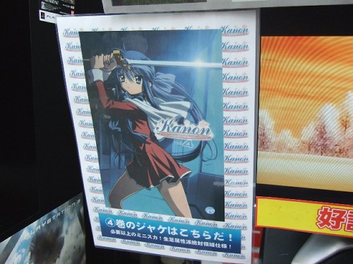 3月6日に発売された、DVD「Kanon 3巻」(AA)を「まさに、技術の無駄遣い、感動の無駄遣い!」として販売していたゲームシティ店頭にて、4月4日発売予定のDVD「Kanon 4巻」(AA)の、コトブキヤからフィギュアの発売(AM)も決まっている、川澄舞のジャケットイラストが公開されていました。