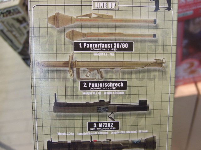 1/6スケールで、全高150mm〜28mm。M-136、Panzerfaust30/60、Panzerschreck、M72A2、M202A1の5種×2色の10種+αシークレット(FIM-92スティンガー/ヤフオク調べ)1種。1BOX10個入り。