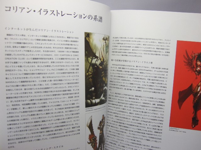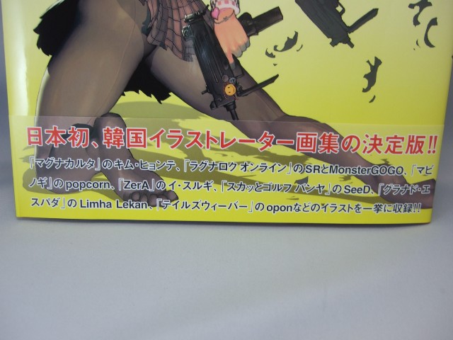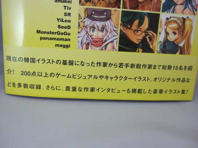 これは、韓国の有名イラストレーターのイラストを集めた画集で、オビによると「日本初、韓国イラストレーター画集の決定版! 「マグナカルタ」のキム・ヒョンテ、「ラグナロクオンライン」のSRとMonsterGOGO、「マビノギ」のpopcorn、「ZerA」のイ・スルギ、「スカッとゴルフ パンヤ」のSeeD、「グラナド・エスパダ」のLimha Lekan、「テイルズウィーバー」のoponなどのイラストを一挙に収録!!」と紹介され、さらに裏表紙のオビでは「現在の韓国イラストの基盤になった作家から若手新鋭作家まで総勢15名を紹介!200点以上のゲームビジュアルやキャラクターイラスト、オリジナル作品などを多数収録。さらに、貴重な作家インタビューも掲載した豪華イラスト集!」と紹介されています。