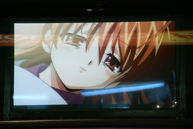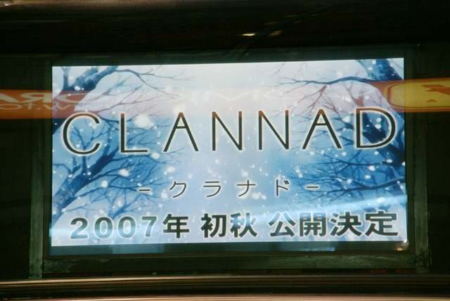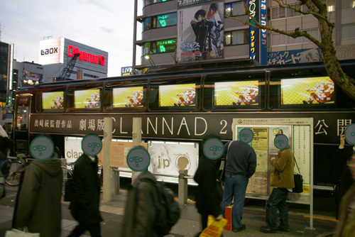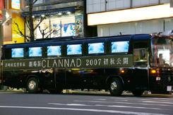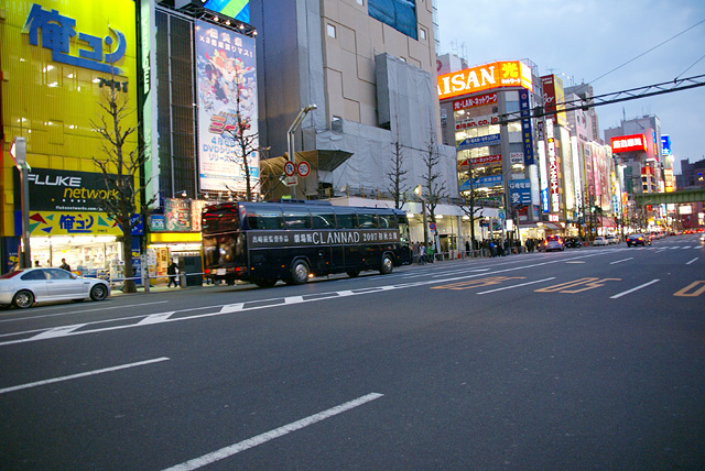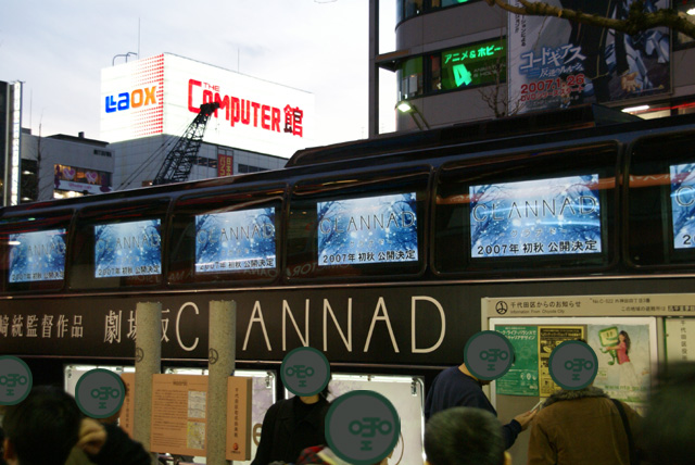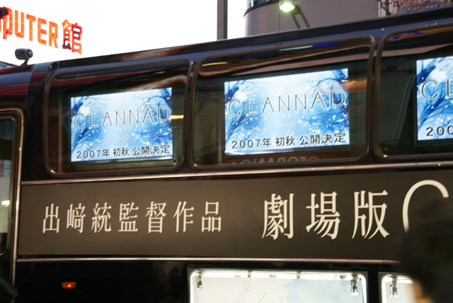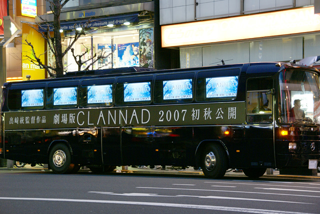 劇場版 CLANNAD −クラナド− 公式でも告知されていたように、3月10日にアキバで「公開決定記念スターティングキャンペーン」が行われたようで、電撃の記事によると昼間にはコスプレさんによる配布イベントもあったみたいです。自分が巡回した午後5時頃には、コスプレさんや配布イべントなどは終了していましたが、窓全てモニターの「特別仕様バス」はまだ運行中でした。